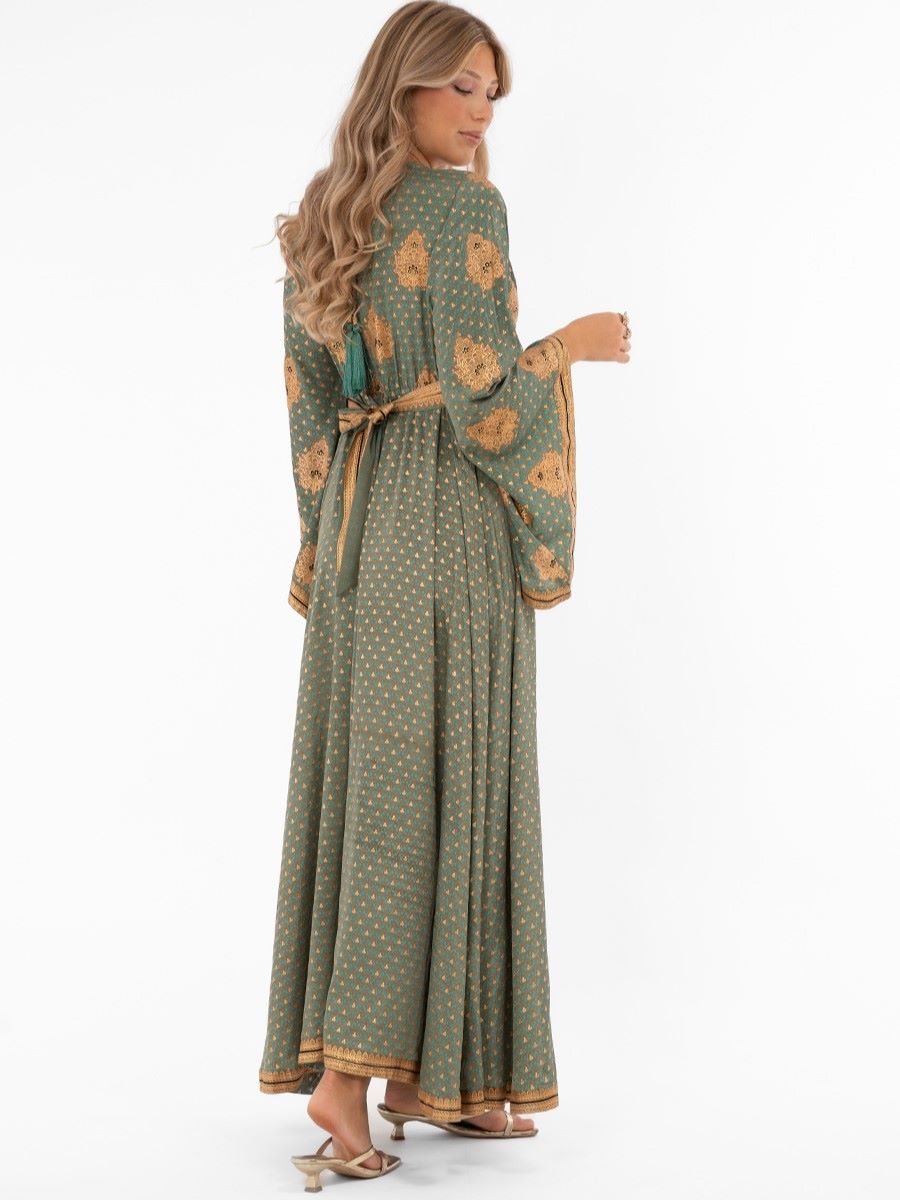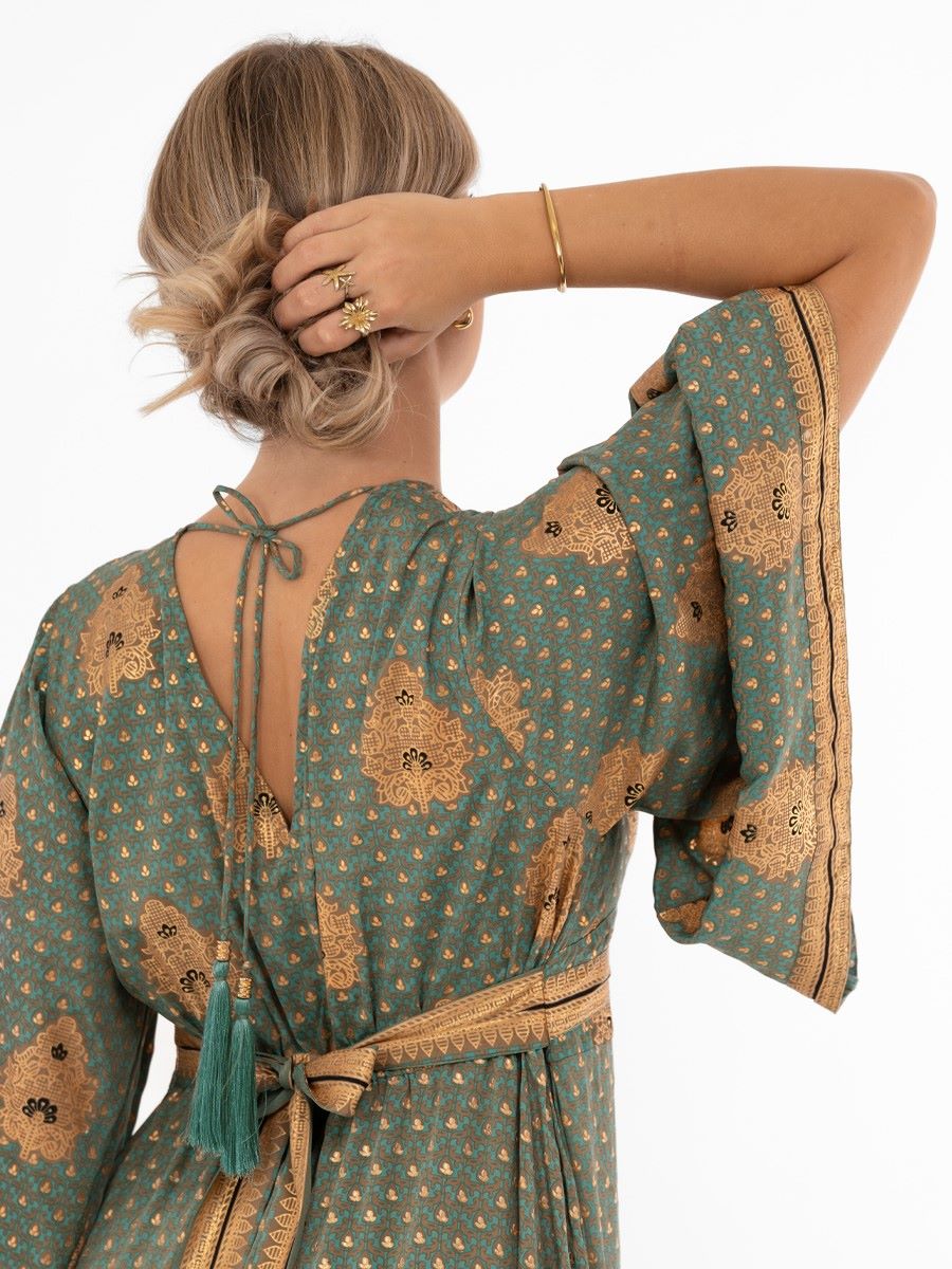 Capri Collectionin Ayla-mekko on täydellinen kesämekko kaikkiin tilaisuuksiin! Mekossa on uskomattoman kaunis turkoosin ja kullan sävyinen medaljonkikuvio, joka antaa sille elegantin ja boheemin ilmeen. Yläosaa ja hihoja koristavat suuret kultaiset medaljongit, kun taas helmaosassa on pienempiä medaljonkeja samalla turkoosilla pohjalla – harmoninen kontrasti, joka luo eloa ja liikettä mekkoon. Mekossa on v-pääntie sekä edessä että takana. Pääntiessä on koristeellisilla tupsuilla varustettu nauha, joten voit säätää leveyttä ja tyyliä itse. Rinnan alla on leveä leikkaus, jossa on kaunis reunus eri kuvioinnilla, joka korostaa vyötäröä. Ayla-mekossa on kuminauha takana ja leveät nauhat sivuilla täydellisen istuvuuden takaamiseksi. Levenevässä hameosassa on elegantti halkio edessä keskellä, joka antaa ilmavan ja naisellisen laskeutumisen.