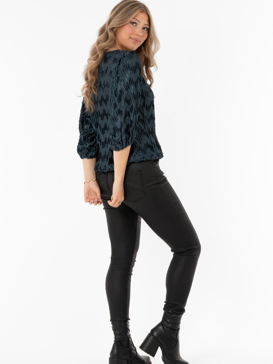 Capri Collectionin, kauniin hohtava Jewel Plisse pusero. Puserossa vaakatasossa siksak kuvio. Rento istuvuus, pyöreä pääntie ja helmassa kuminauha. Niskassa pieni aukko ja nappikiinnitys. 3/ hihat, joissa kuminauhat.