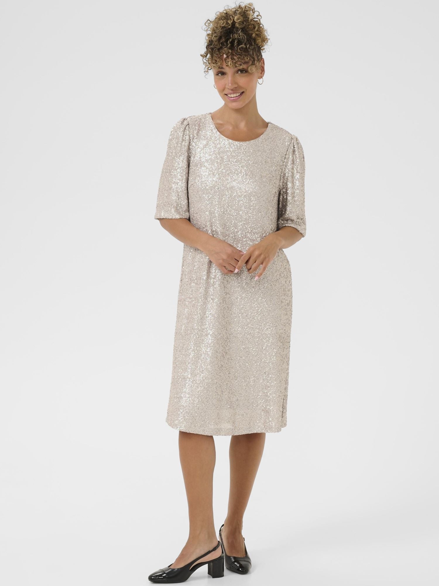 Creamin loistelias Diddi mekko kahdessa värissä, punainen ja champanja. Suora kotelomekko jossa vuori. Kauniit läpikuultavat hihat. Rypytetyt olkapäät. Pyöreä pääntie. Säihkyvä, mattapintainen paljettimekko juhlaan.