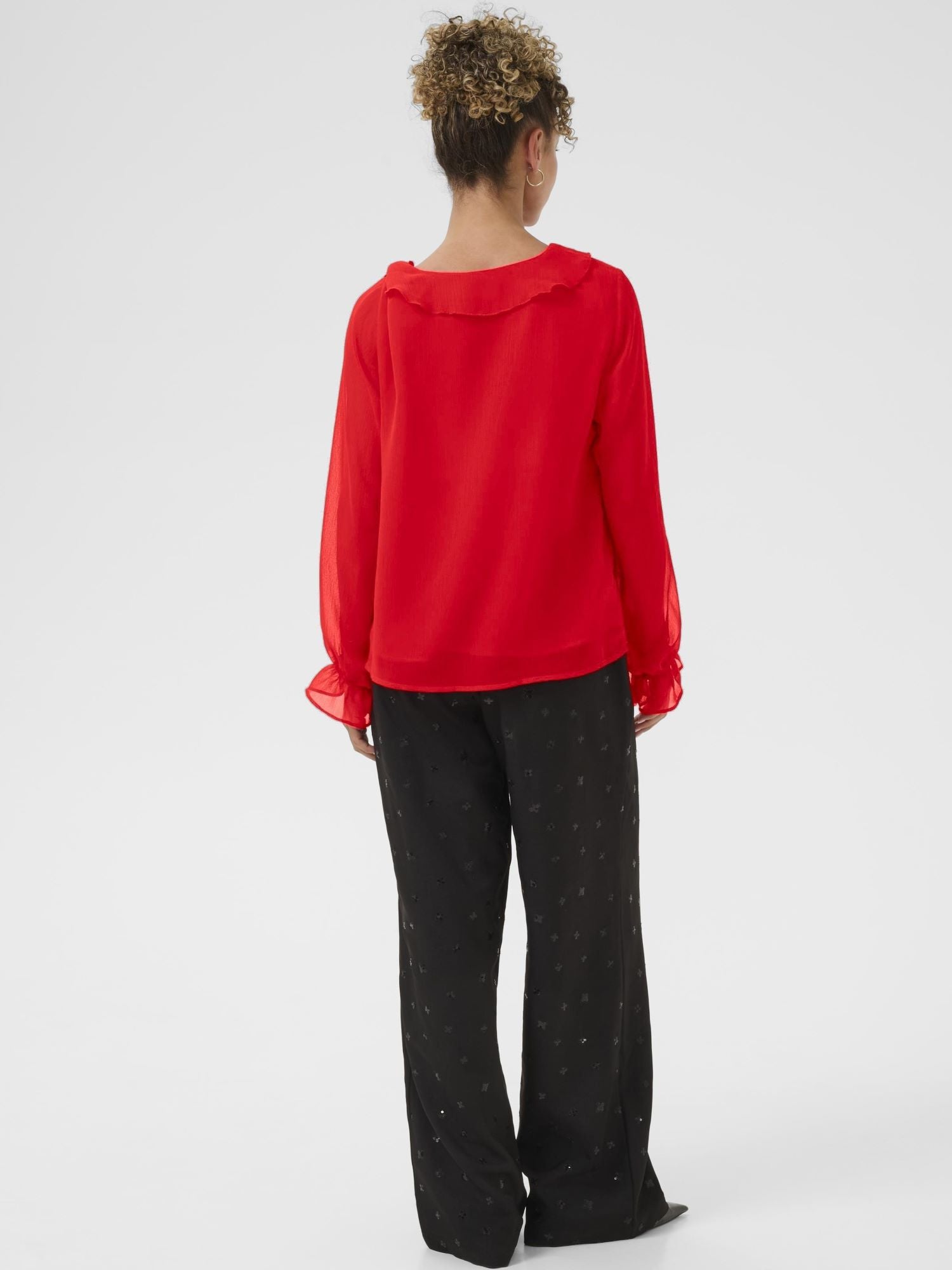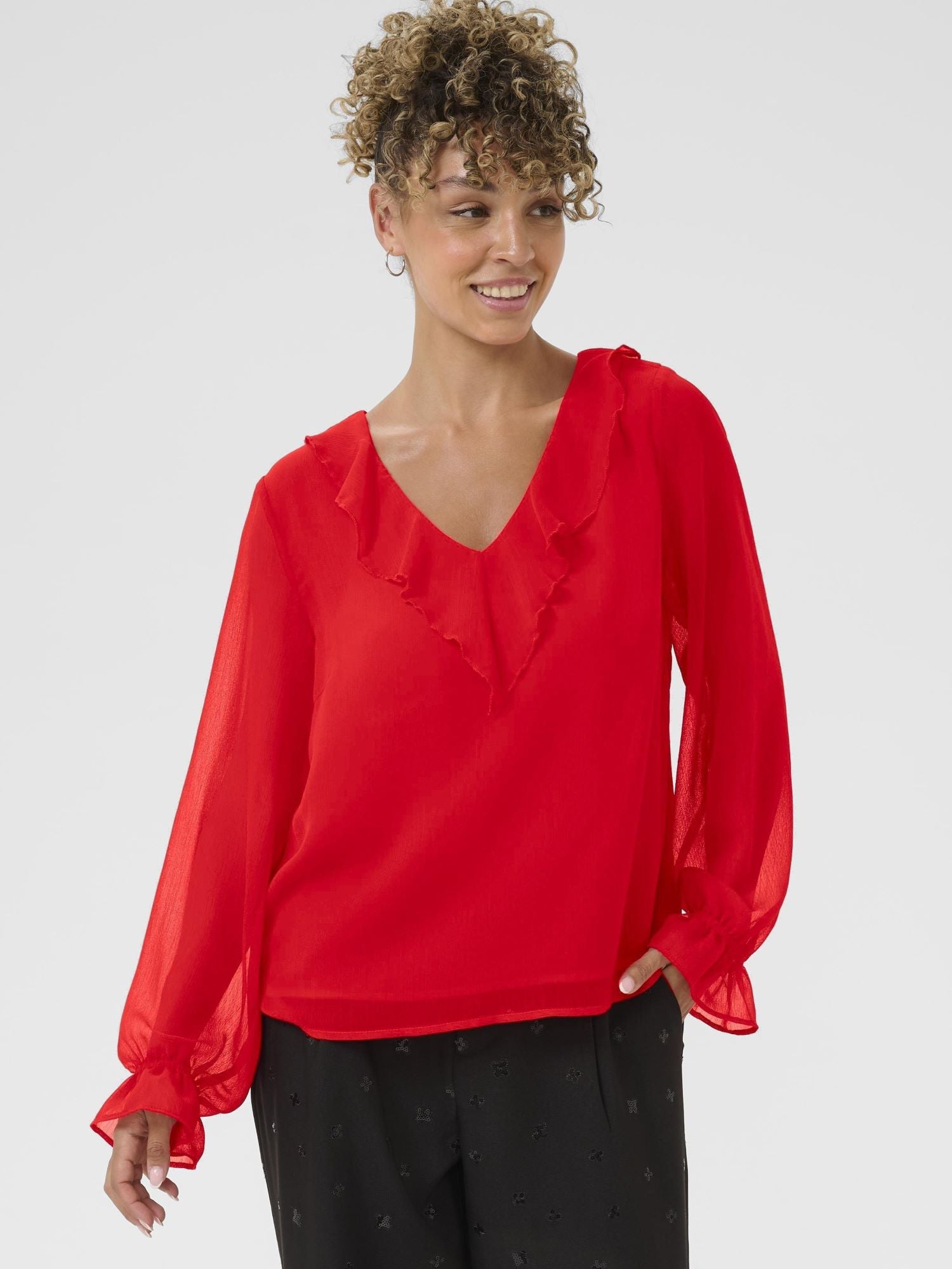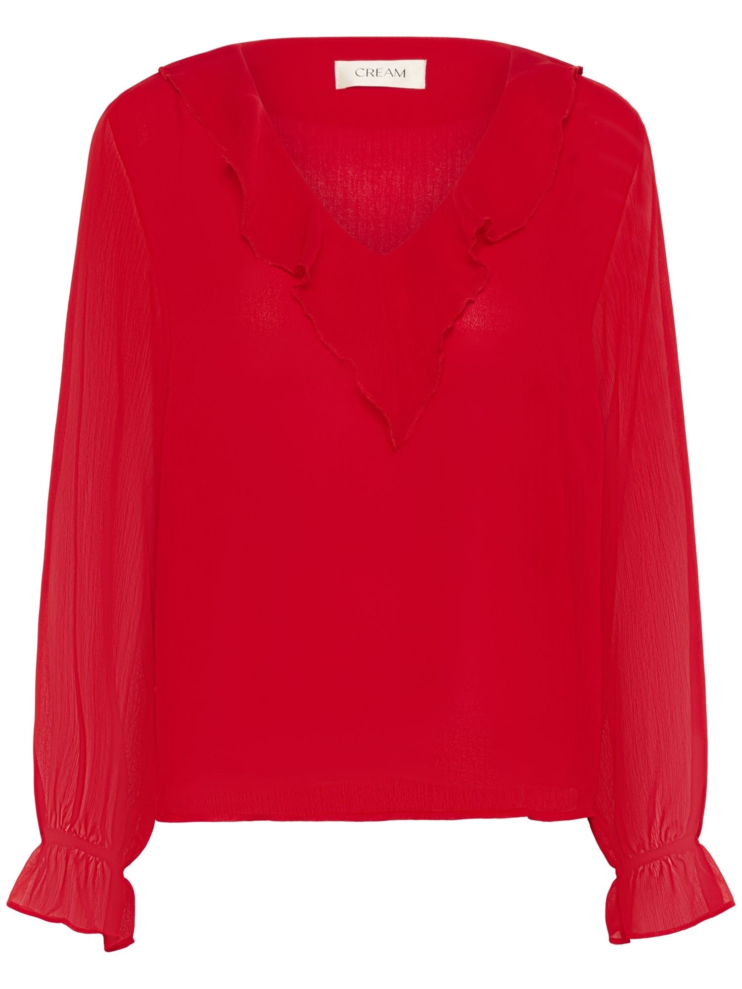 Creamin hurmaava Flake pusero. V-pääntie Frilla pääntiellä. tyylikäs suora malli. Flake pusero on monikäyttöinen,, käytä sitä jakun ja juhlahousujen kanssa. Hihansuissa frilla ja kuminuha. Läpikuultavat hihat, muuten pusero on vuoritettu.