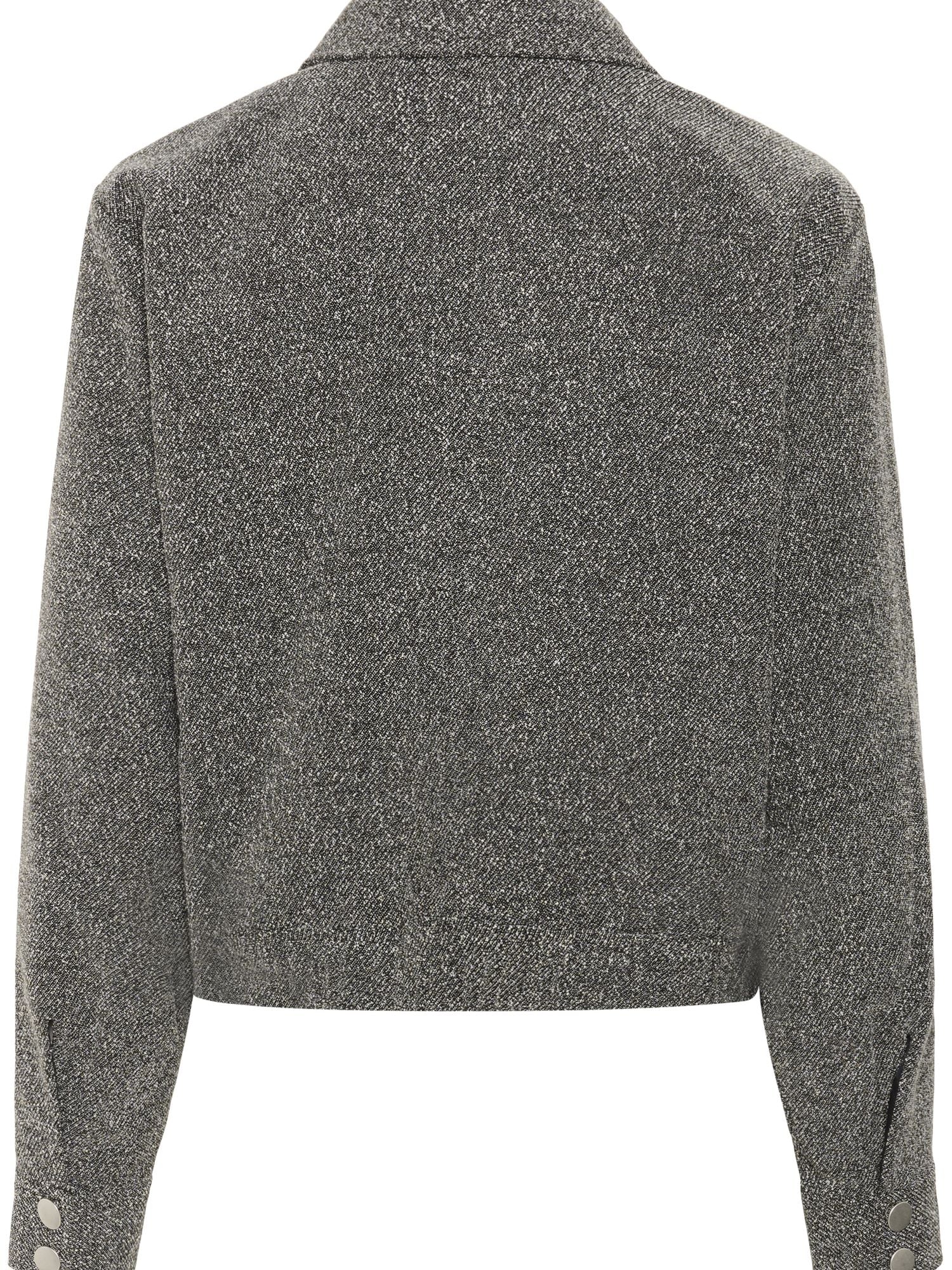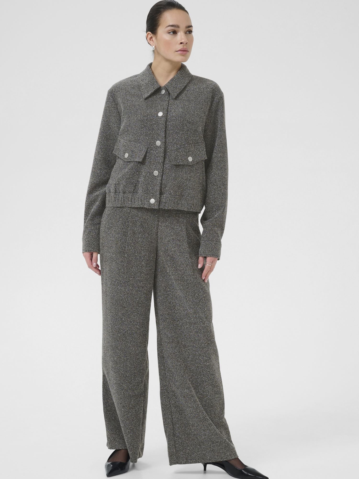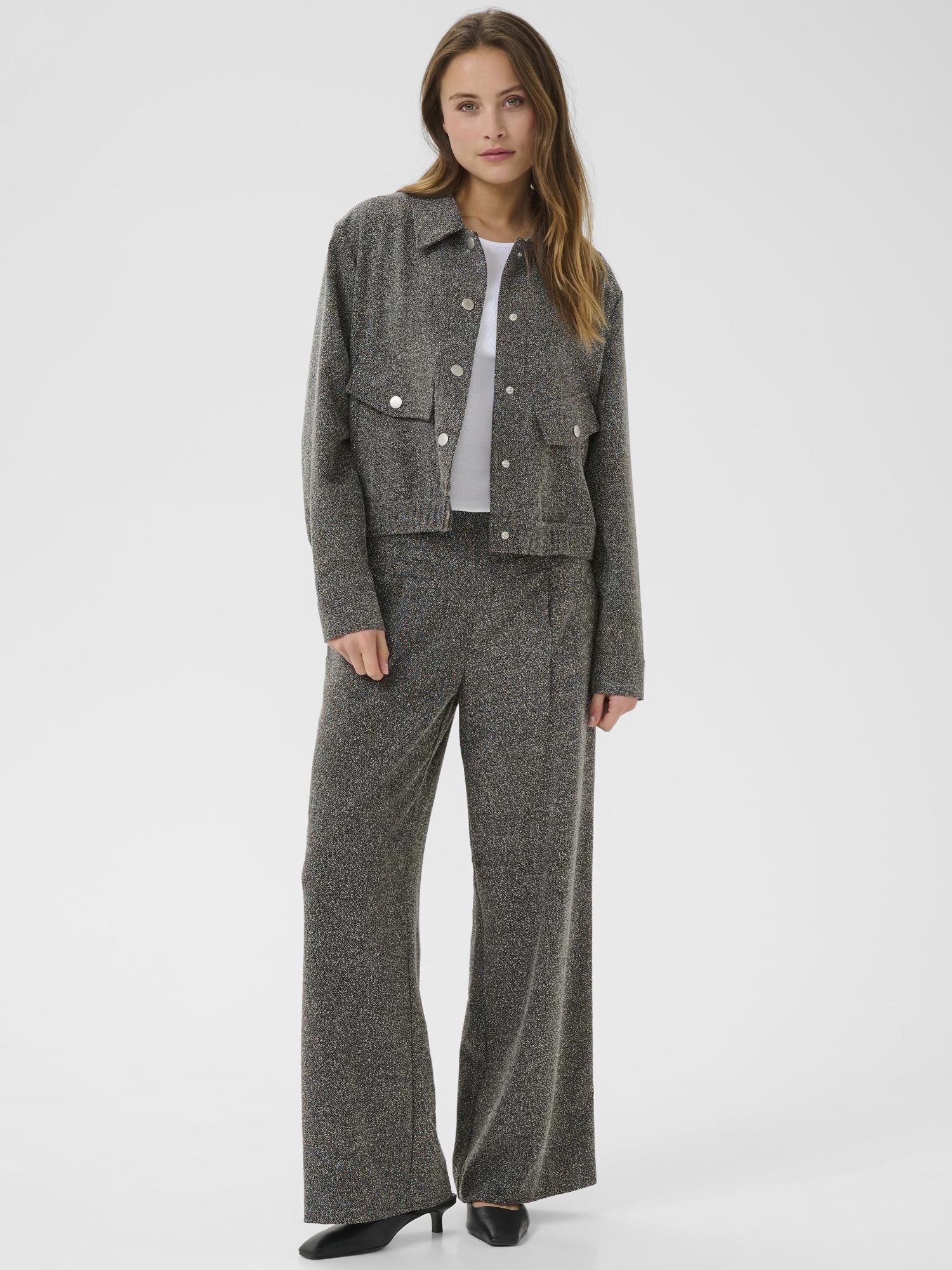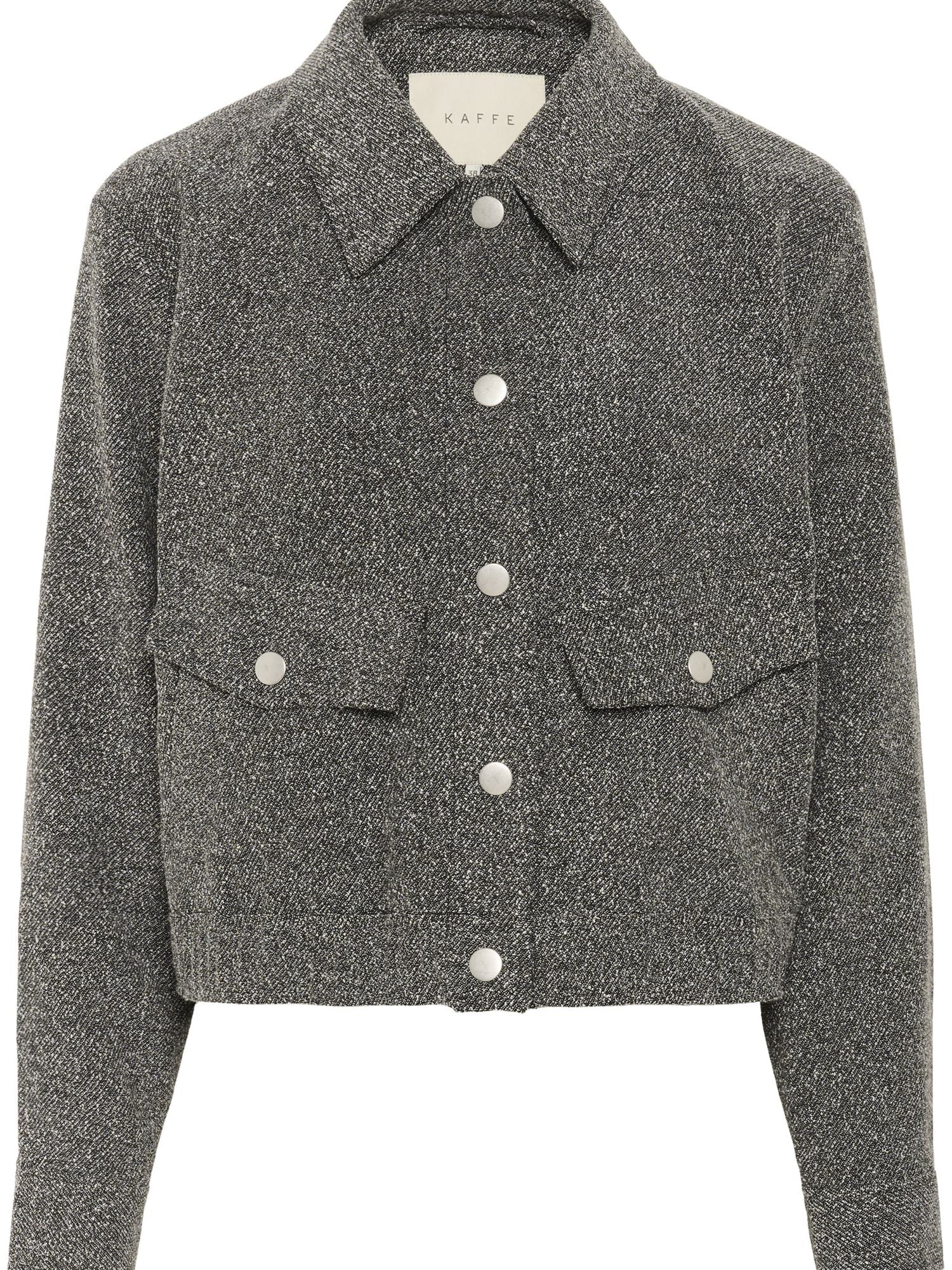 Kaffen tyylikäs harmaameleerattu takki. Luo moderni ilme tällä takilla. Tyylikäs muotoilu ja meleerattu pinta antavat tälle takille ajattoman ilmeen ja naisellisen istuvuuden. Kaulukset ja nepparilista. Hihansuissa nepparikiinnitys. Valetaskut, joissa nepparit. Lyhyt malli. Leveä kuminauha helmassa. Käytä yhdessä Alba Wide Pantsien kanssa.