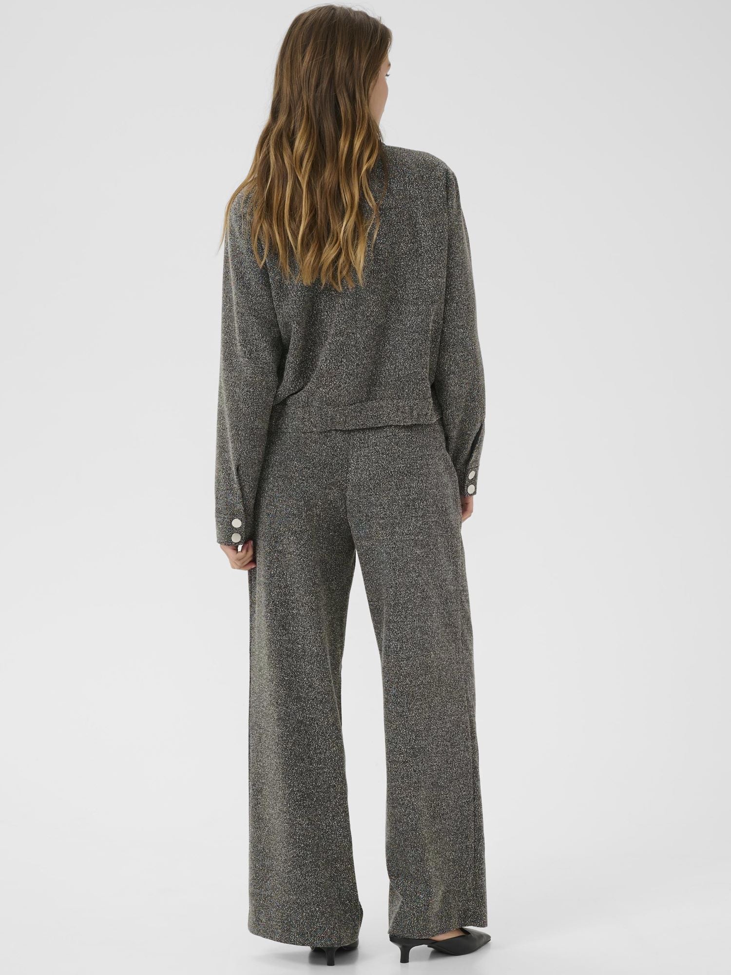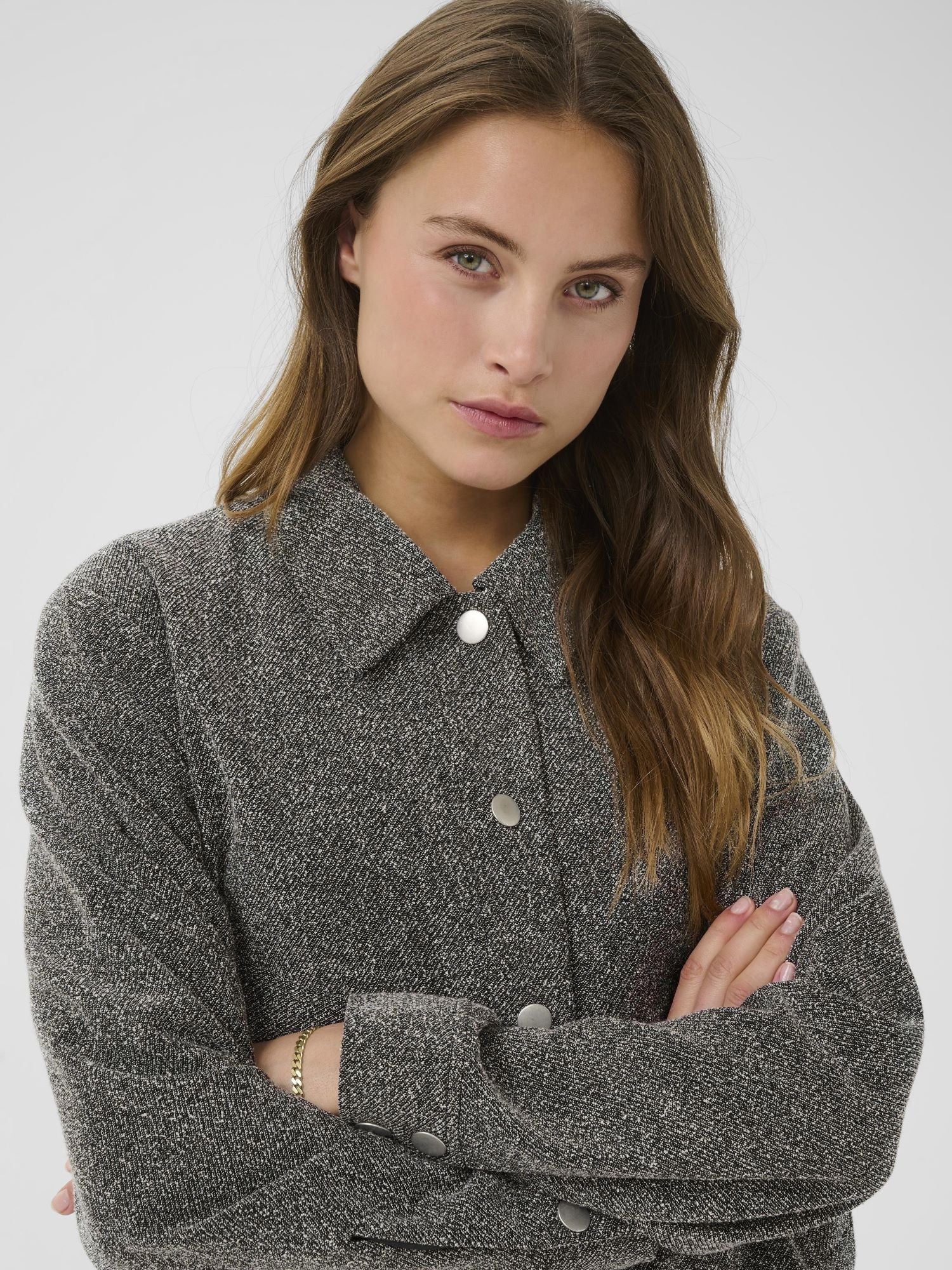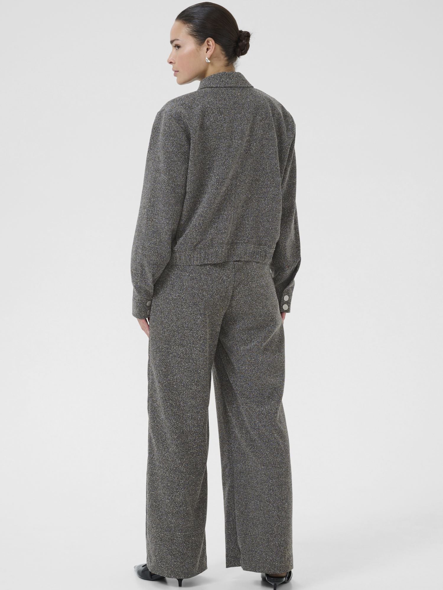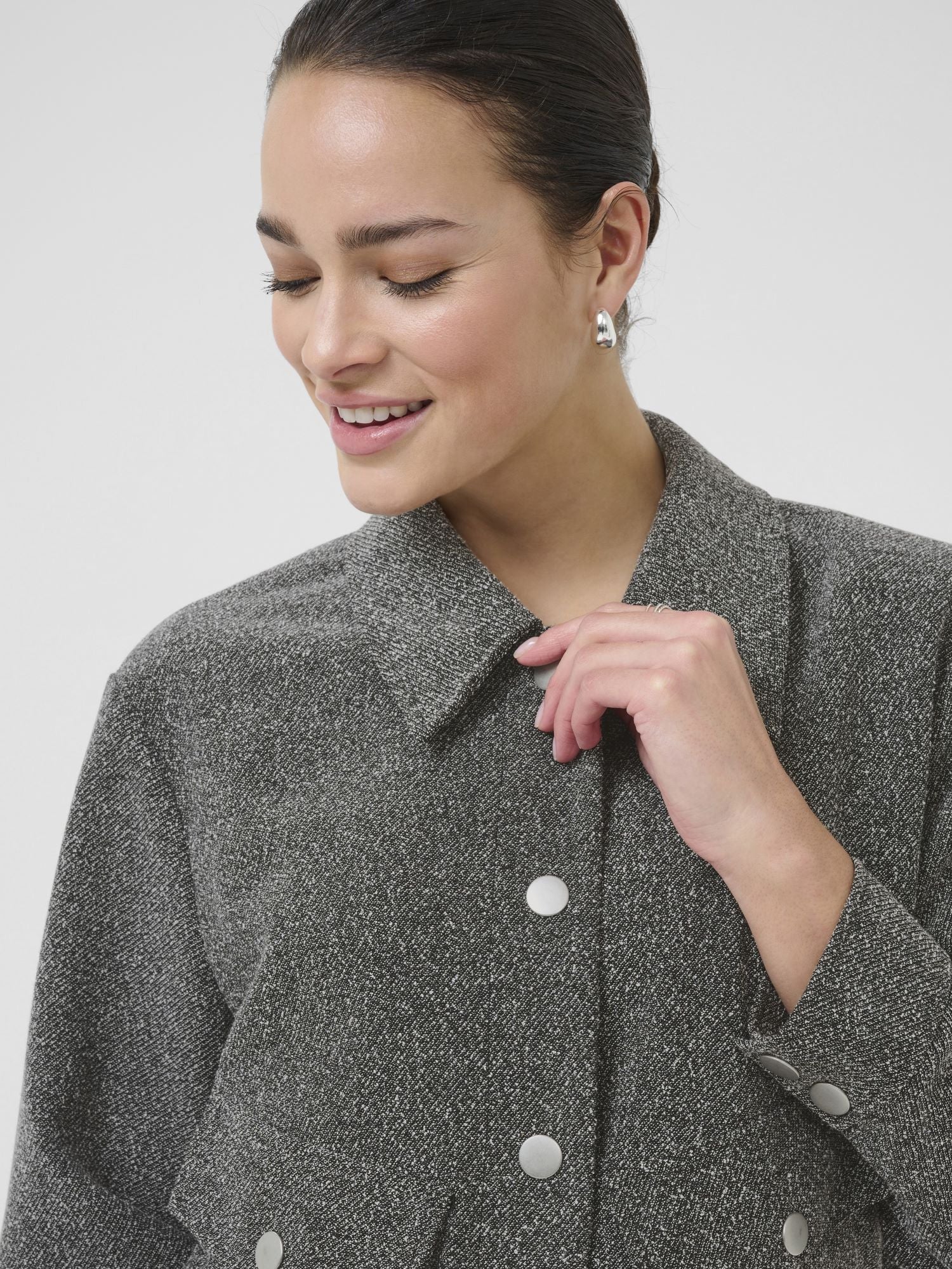 Kaffen tyylikäs harmaameleerattu takki. Luo moderni ilme tällä takilla. Tyylikäs muotoilu ja meleerattu pinta antavat tälle takille ajattoman ilmeen ja naisellisen istuvuuden. Kaulukset ja nepparilista. Hihansuissa nepparikiinnitys. Valetaskut, joissa nepparit. Lyhyt malli. Leveä kuminauha helmassa. Käytä yhdessä Alba Wide Pantsien kanssa.