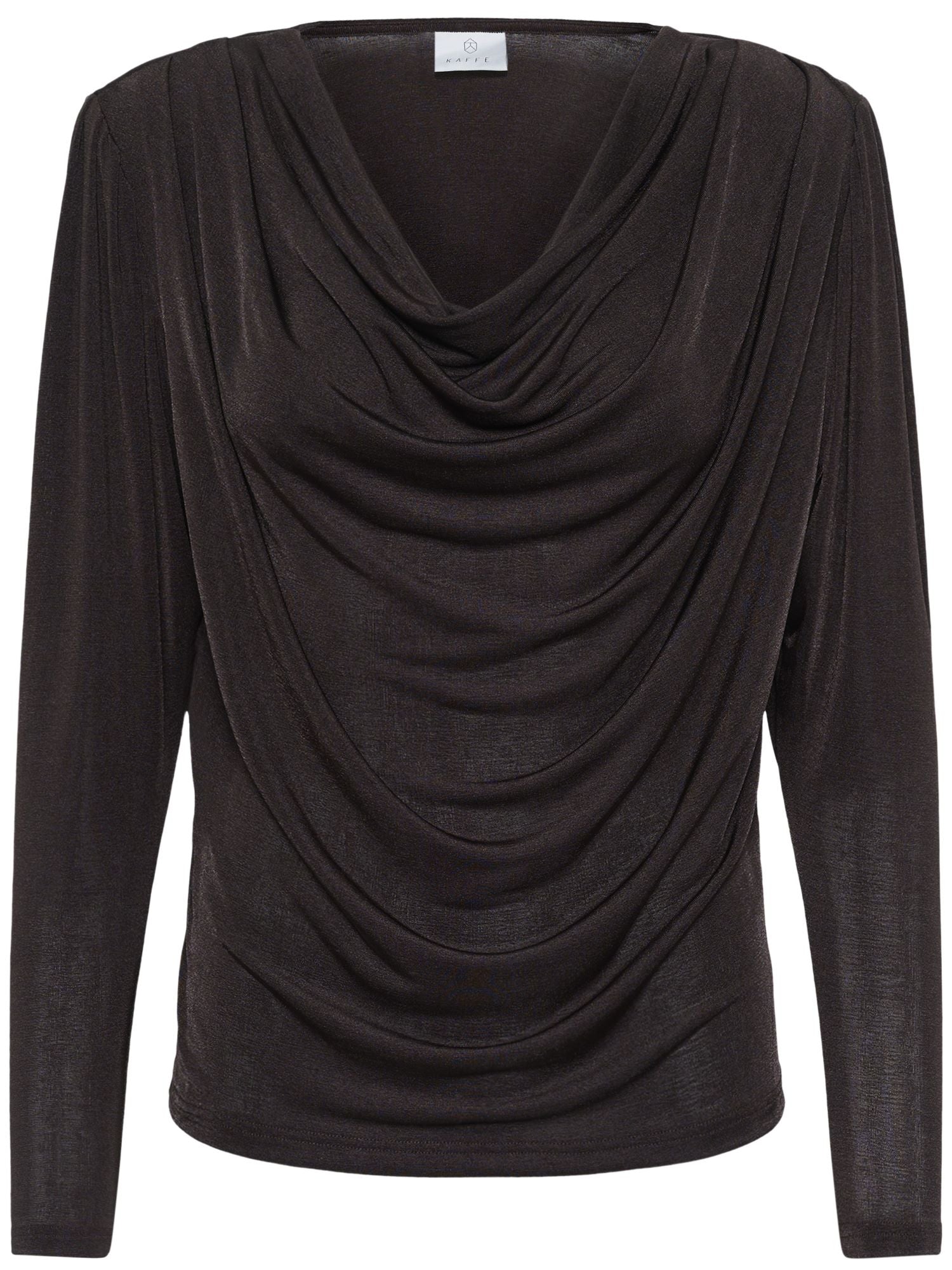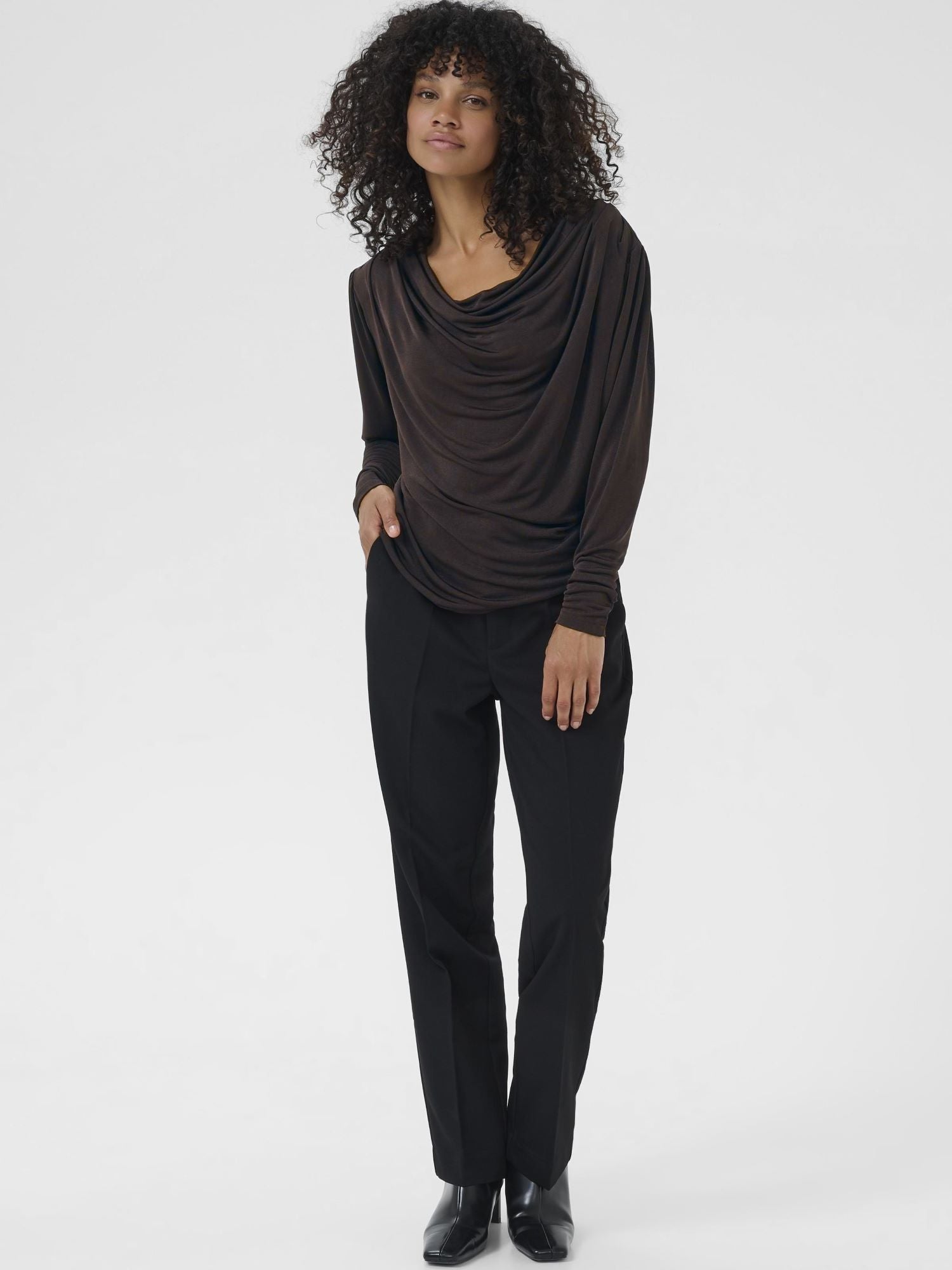 Kaffen Gina pusero on naisellisen tyylikäs. Puserossa on kääntökaulus ja rento istuvuus. Puseron etuosassa on laskoksia. Hihat ovat pitkät ja niissä on kapea istuvuus. Pehmeät poimut myös olkapäillä. Ohuet olkatoppaukset. Tämä pusero on naisille jotka haluavat tyylikkään ja mukavan yläosan.