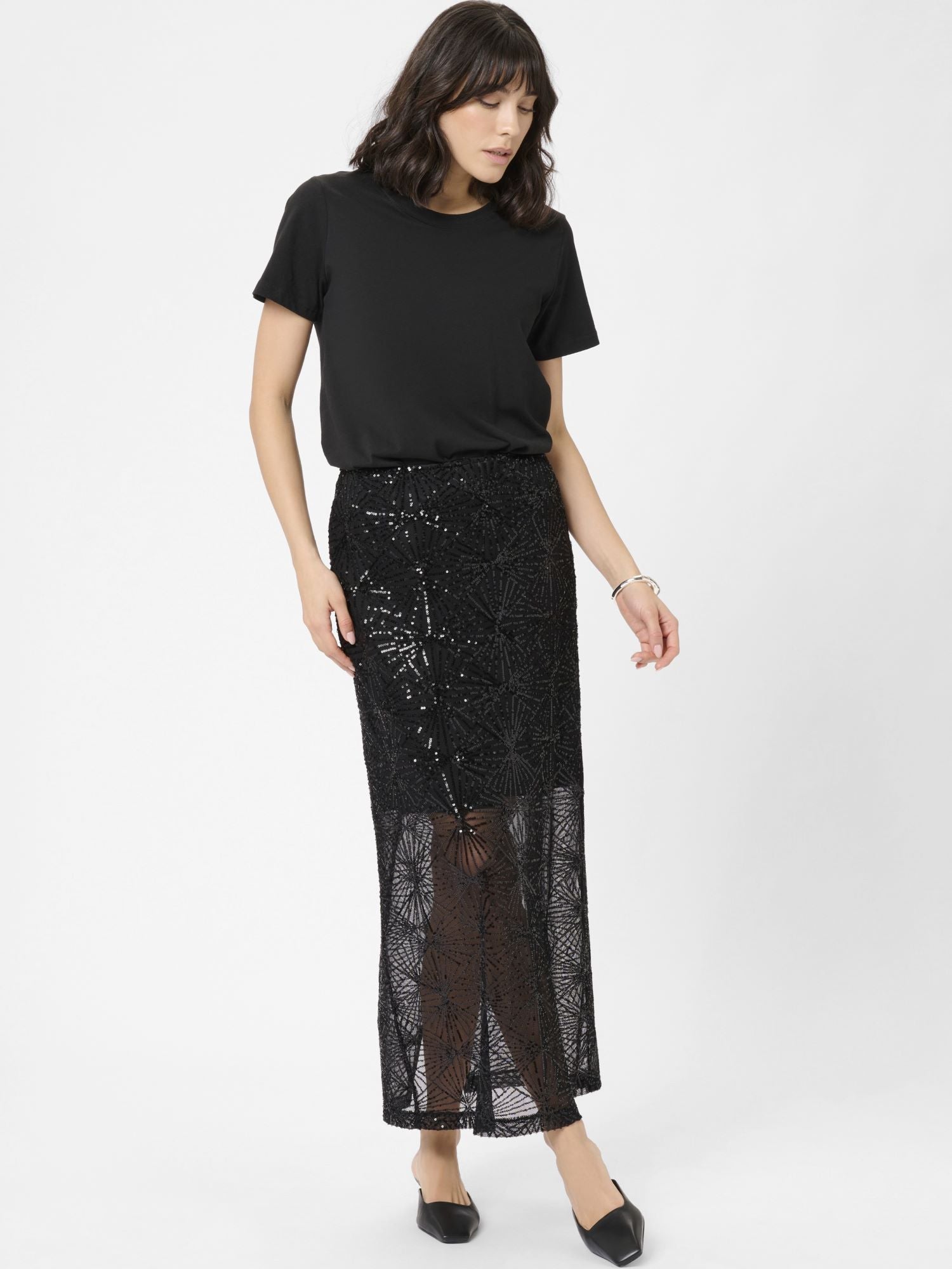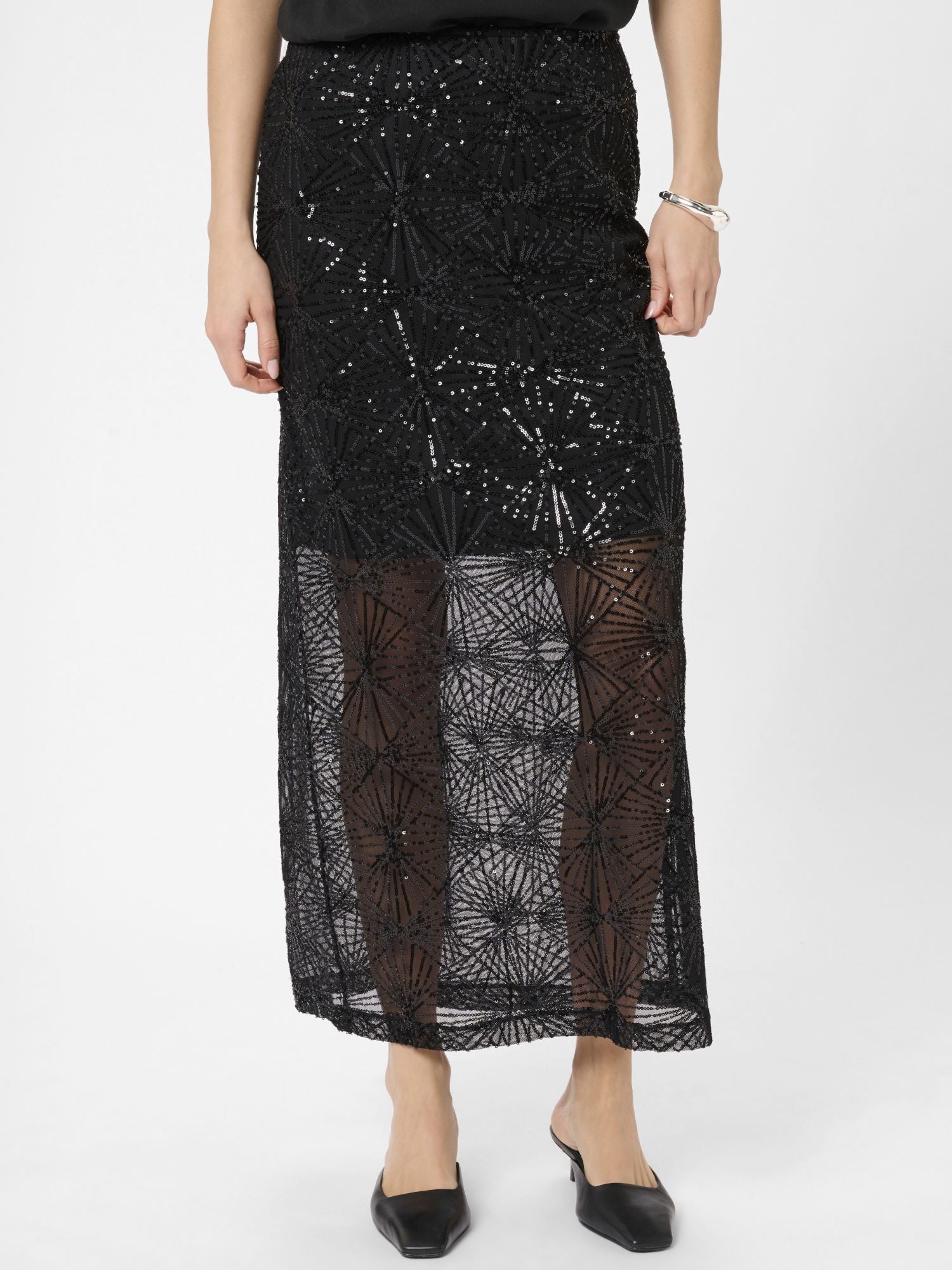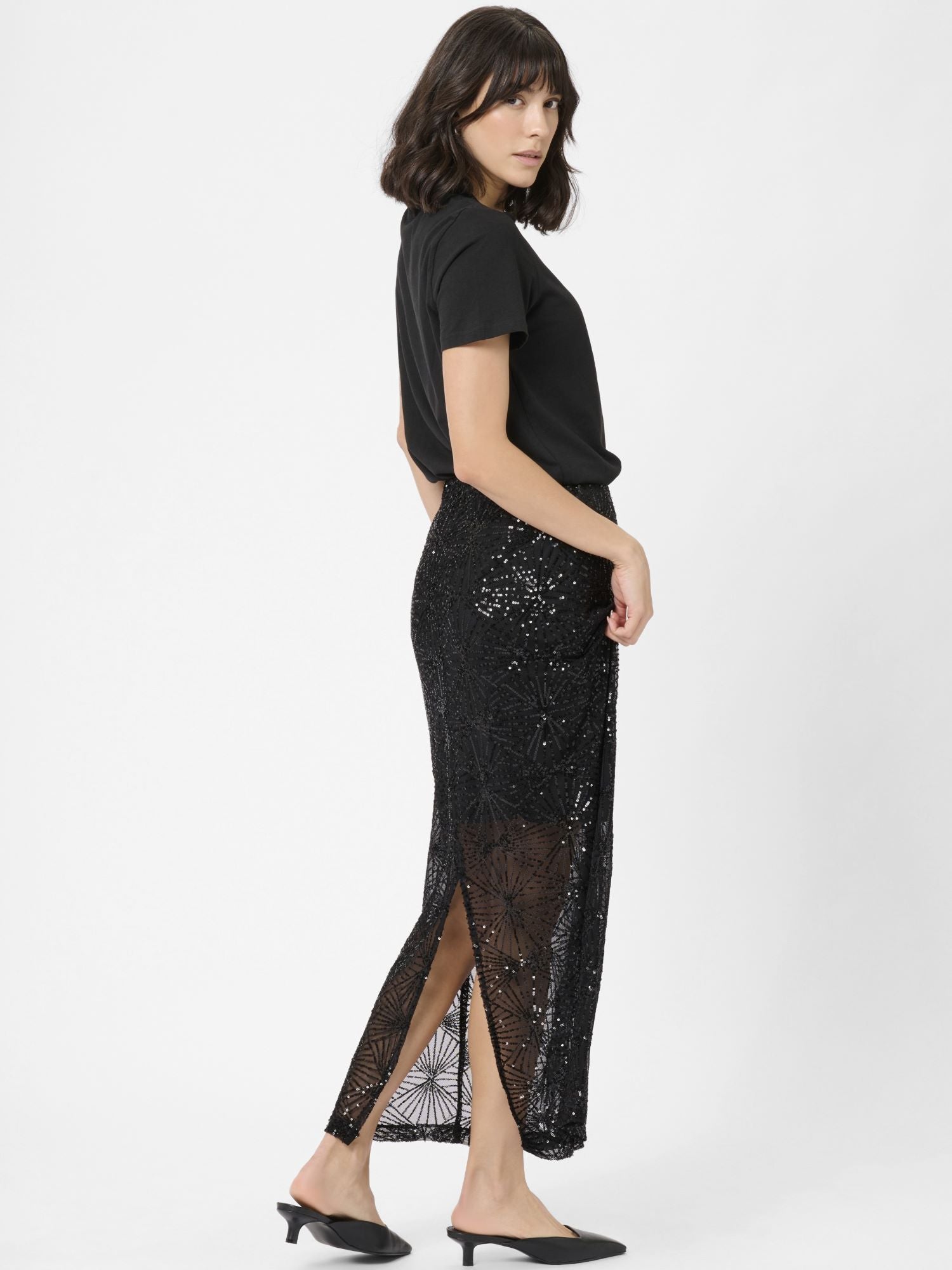 Kaffen pitkässä Linna hameessa on suora siluetti. Geometrisiä paljetteja on päällikankaassa. Hame on läpikuultava. Kuminauha vyötärö. Hameessa on halkio takana.