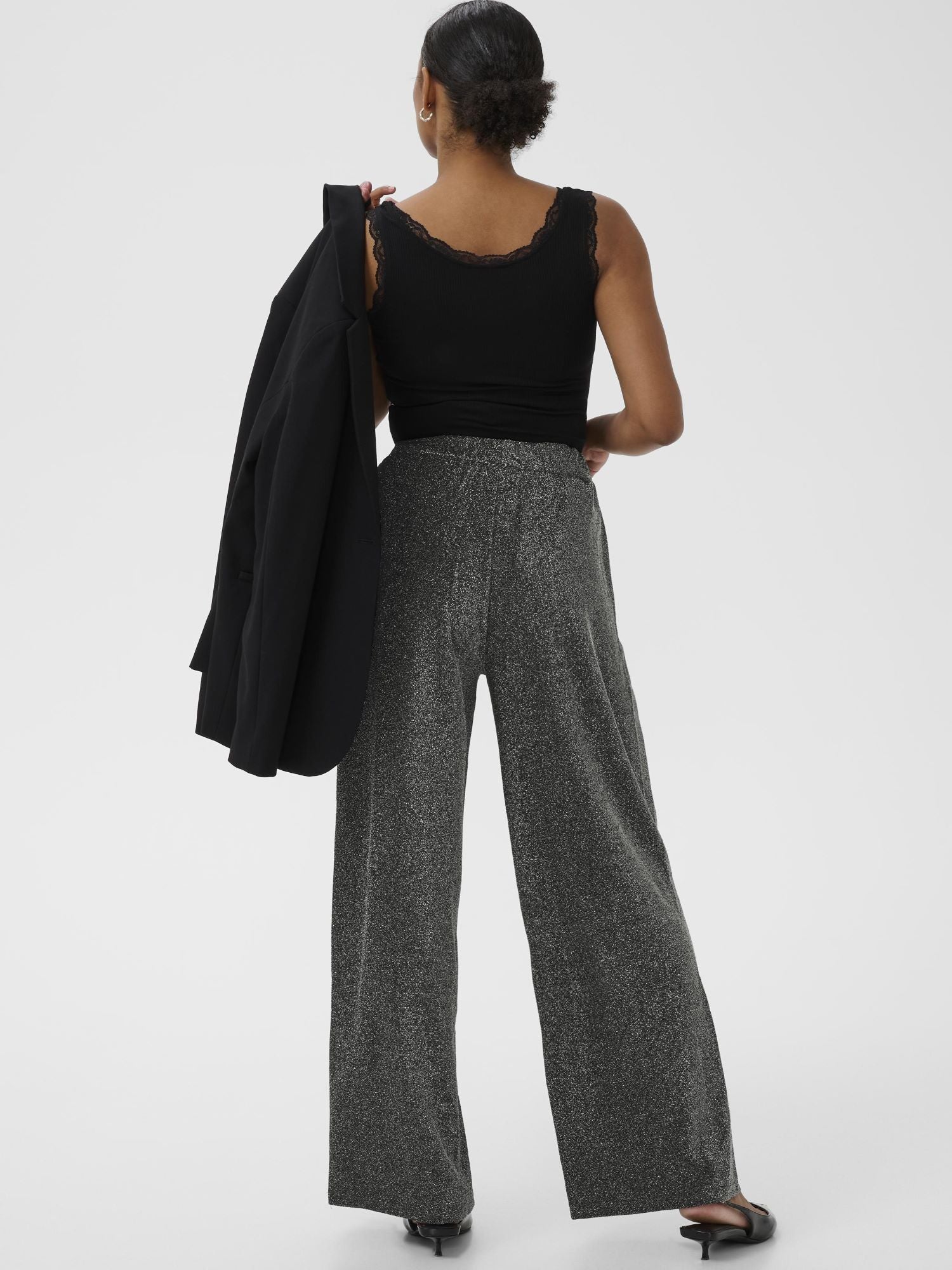 Kaffen Rita housuissa on kimallusta. Joustava kuminauha vyötärö solmittavalla vyöllä. Leveä lahje.