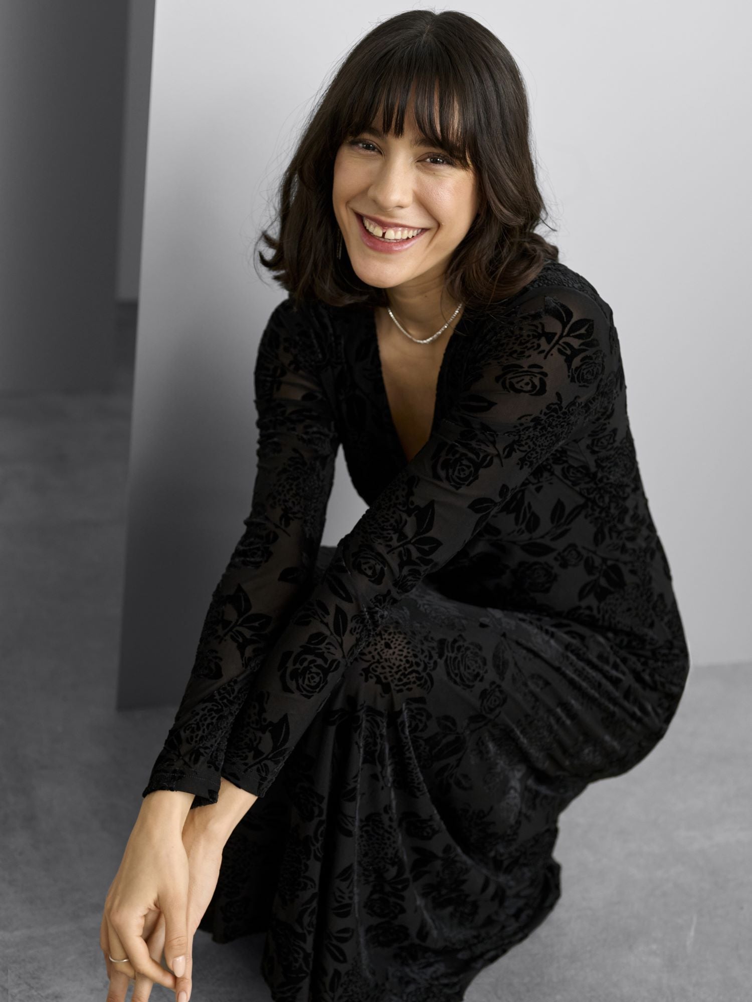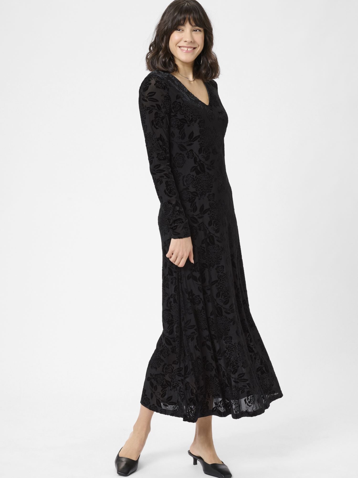 Kaffen naisellisen kaunis, pitkä mekko Rosa. Kaunis kukkakuvio. V-pääntie, istuva yläosa, pitkät hihat. Kevyesti levenevä helma. Erittäin kaunis kokonaisuus.