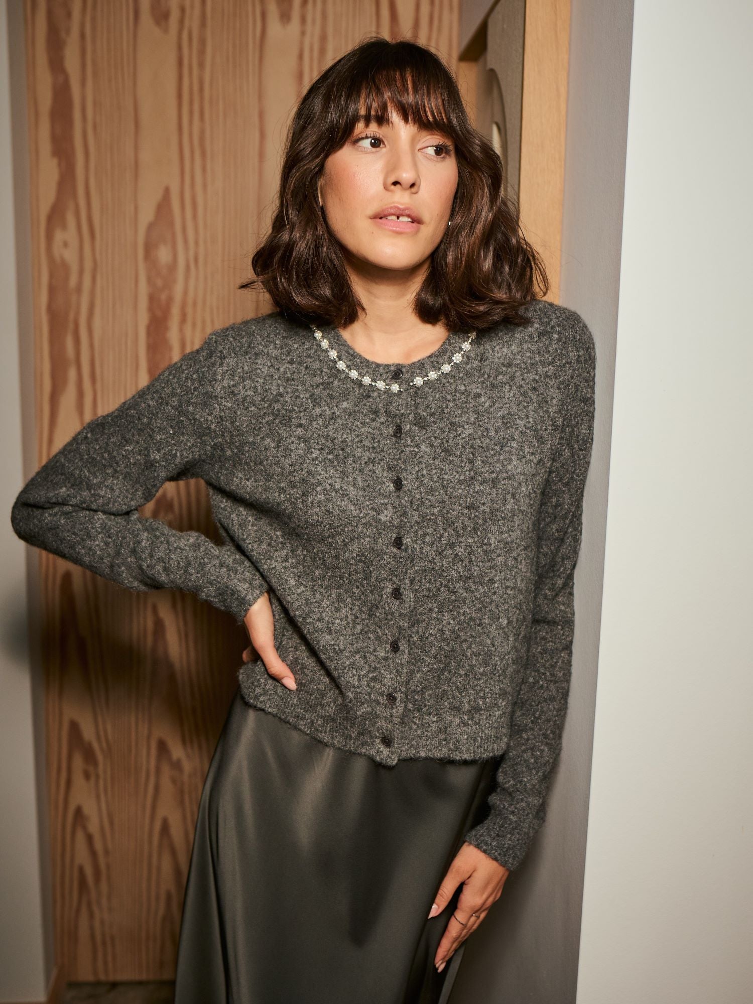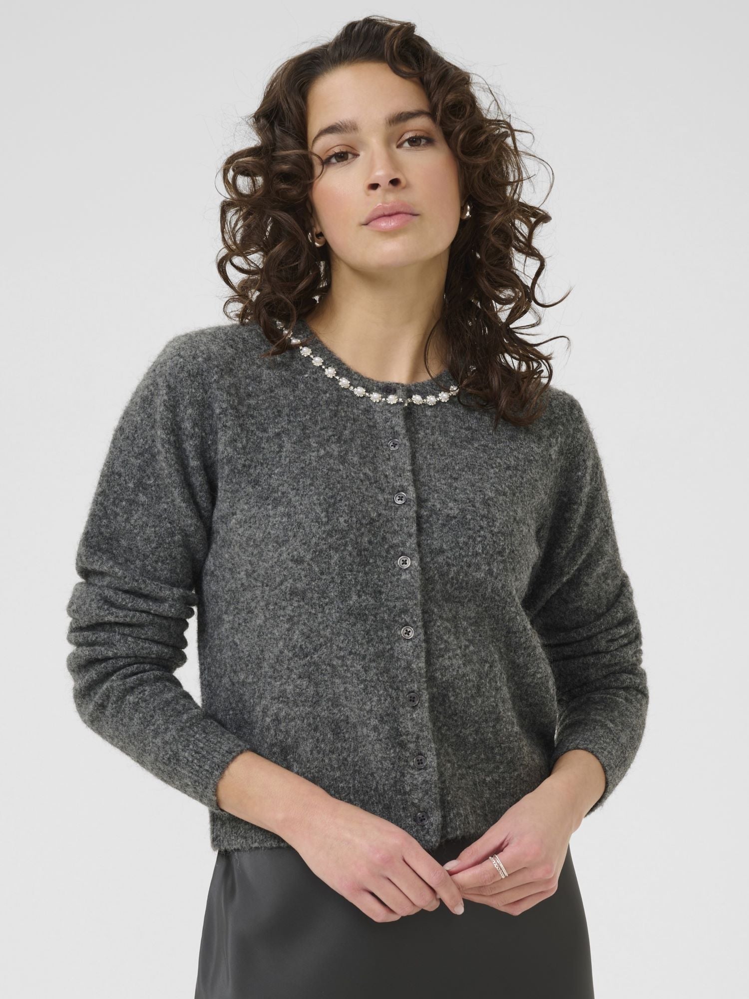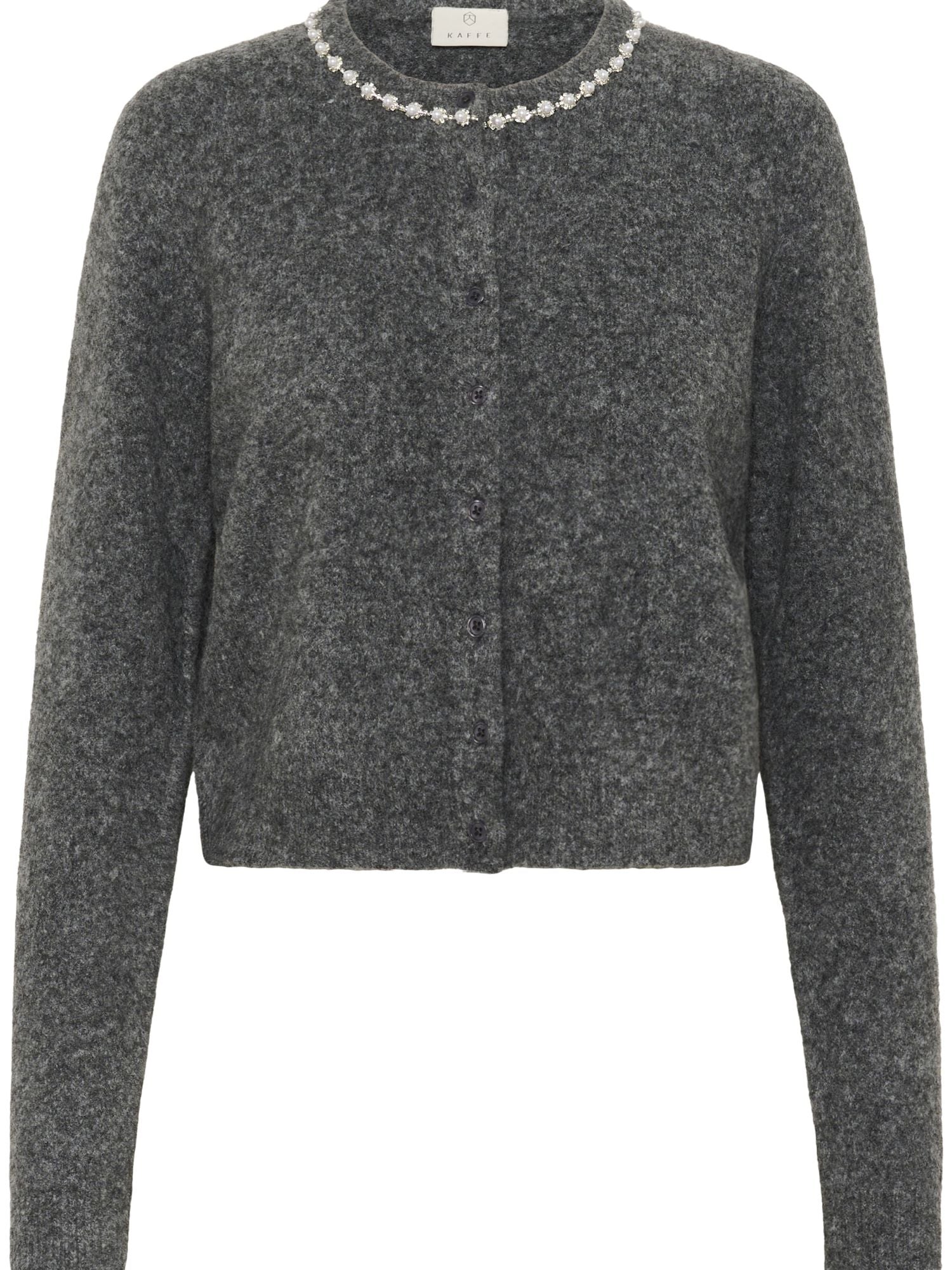 Kaffen Roxy neuletakki on naisellisen kaunis ja ihanan pehmeä. Pyöreä pääntie, jossa helmi- ja timanttikoristelu. Neuletakissa on lyhyt ja suora malli. Nappikiinnitys. Hihansuissa ja helmassa resori. Normaali istuvuus.