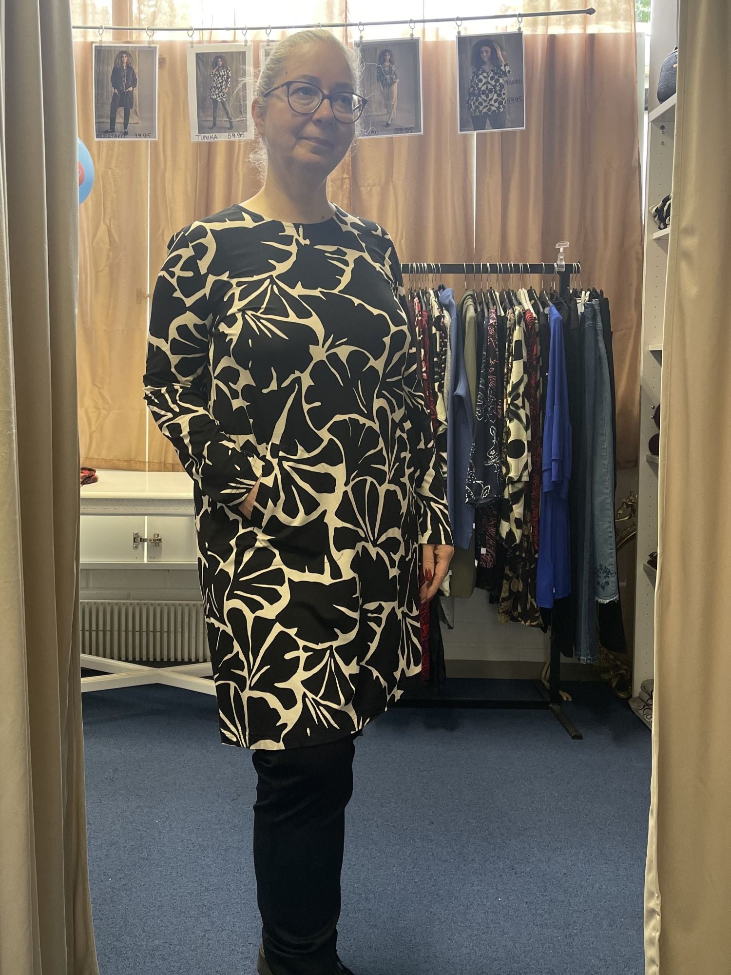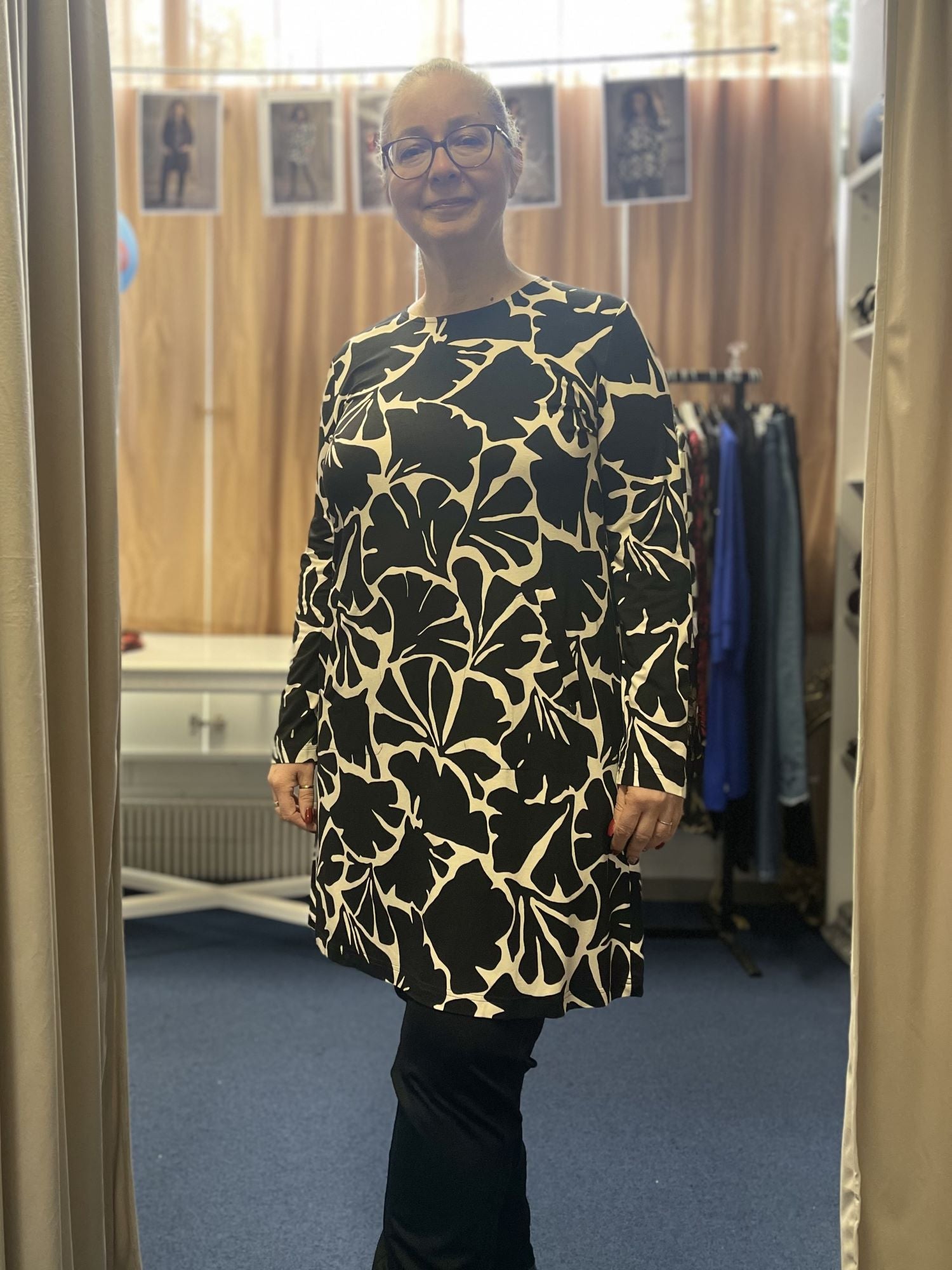 Niccolein kaunis tunika-mekko. Luonnonvalkoinenpohja mustilla kuvioilla. Pyöreä pääntie, niskassa pisaranmuotoinen aukko ja nappi. Hieman A-linjainen.