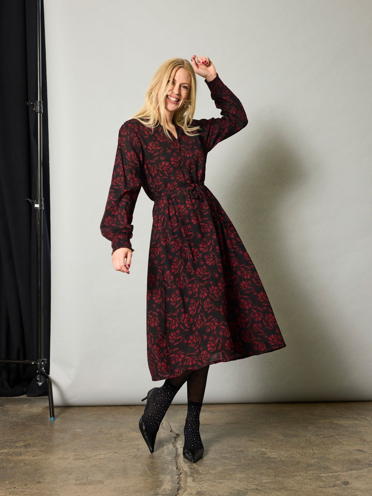 Ze-Zen kukallinen Bianca mekko, mustalla pohjalla ja punaisilla kukilla. Mekossa on pyöreä pääntie jossa pieni v-aukko. Täyspitkä hiha, hihansuissa smokkirypytys. Ohut vyö ja vyölenkit. Mekko on yläosasta tyköistuva, laskeutuu kauniisti leveten alaspäin.