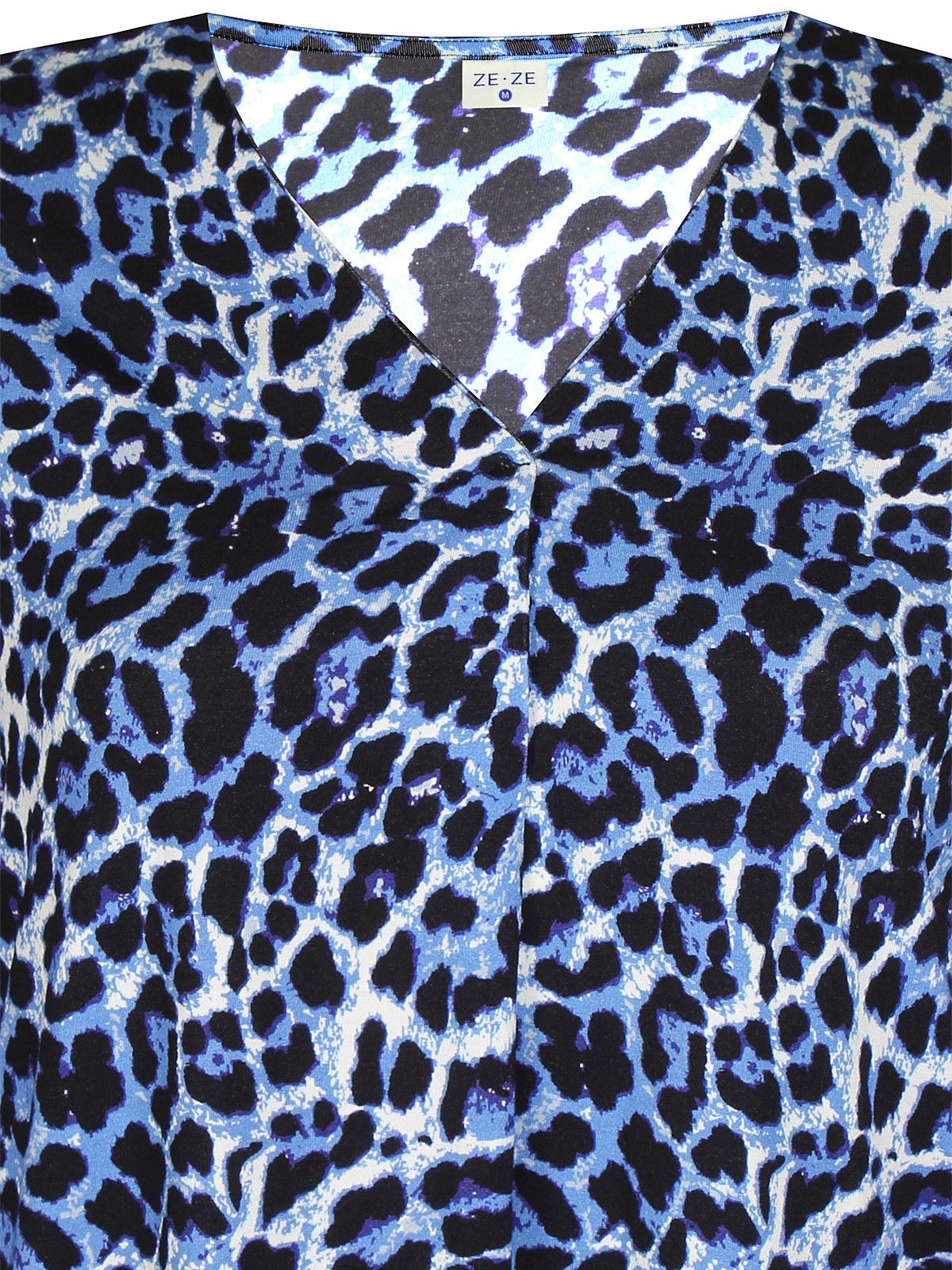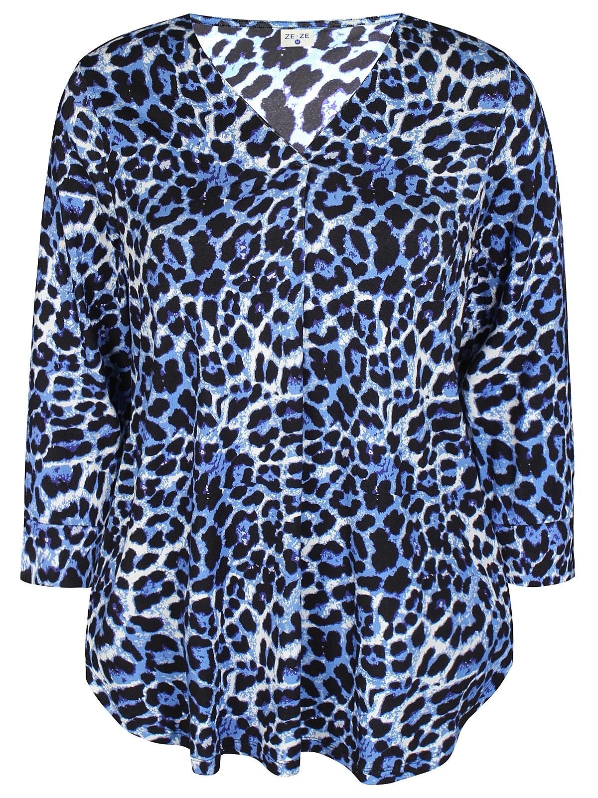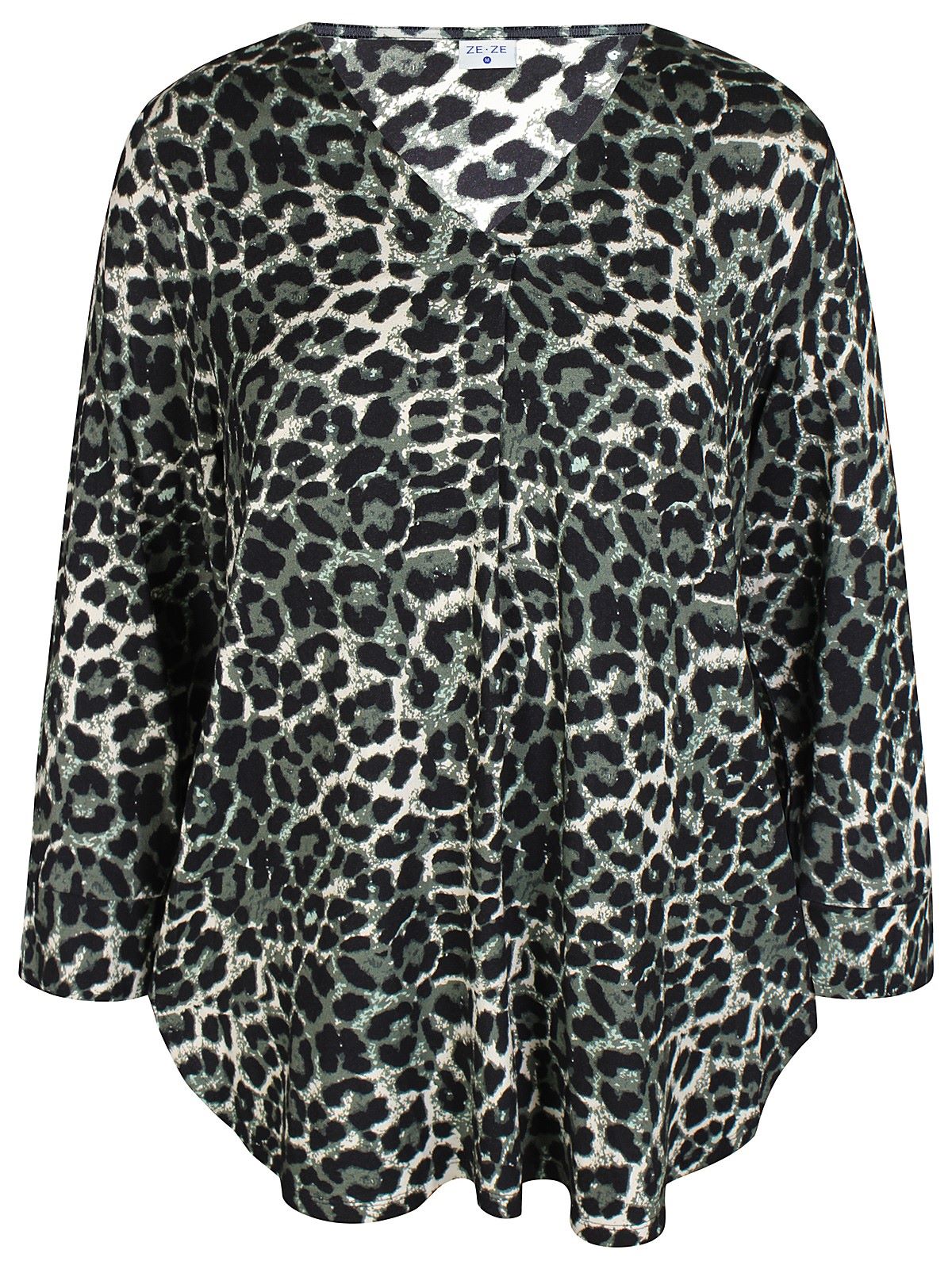Ze-Zen miellyttävän pehmeä viskoositrikoo pusero. Leopardikuosinen. 3/4hiha. V-pääntie, jossa laskos. Kauniisti kaartuva helma. Puseron takana kaarroke, joka tuo puserolle kauniin ryhdin. Suora malli. Normaali mitoitus.