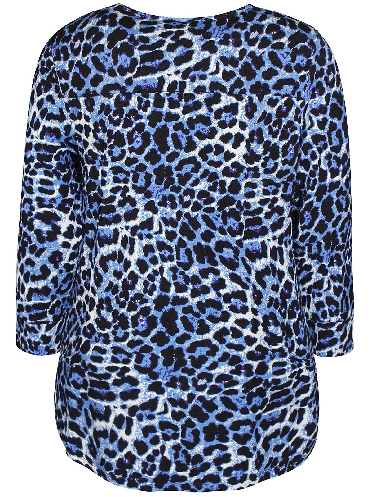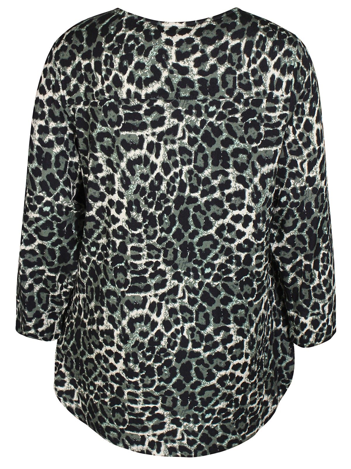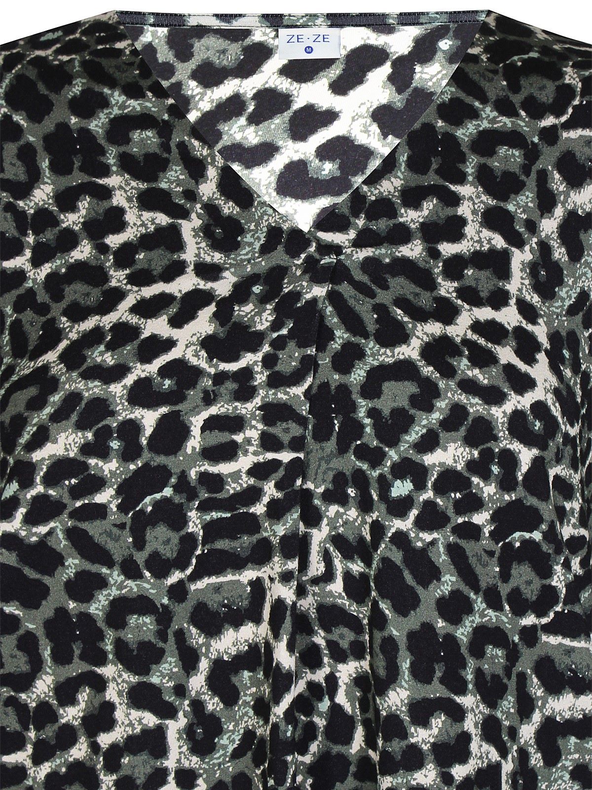 Ze-Zen miellyttävän pehmeä viskoositrikoo pusero. Leopardikuosinen. 3/4hiha. V-pääntie, jossa laskos. Kauniisti kaartuva helma. Puseron takana kaarroke, joka tuo puserolle kauniin ryhdin. Suora malli. Normaali mitoitus.