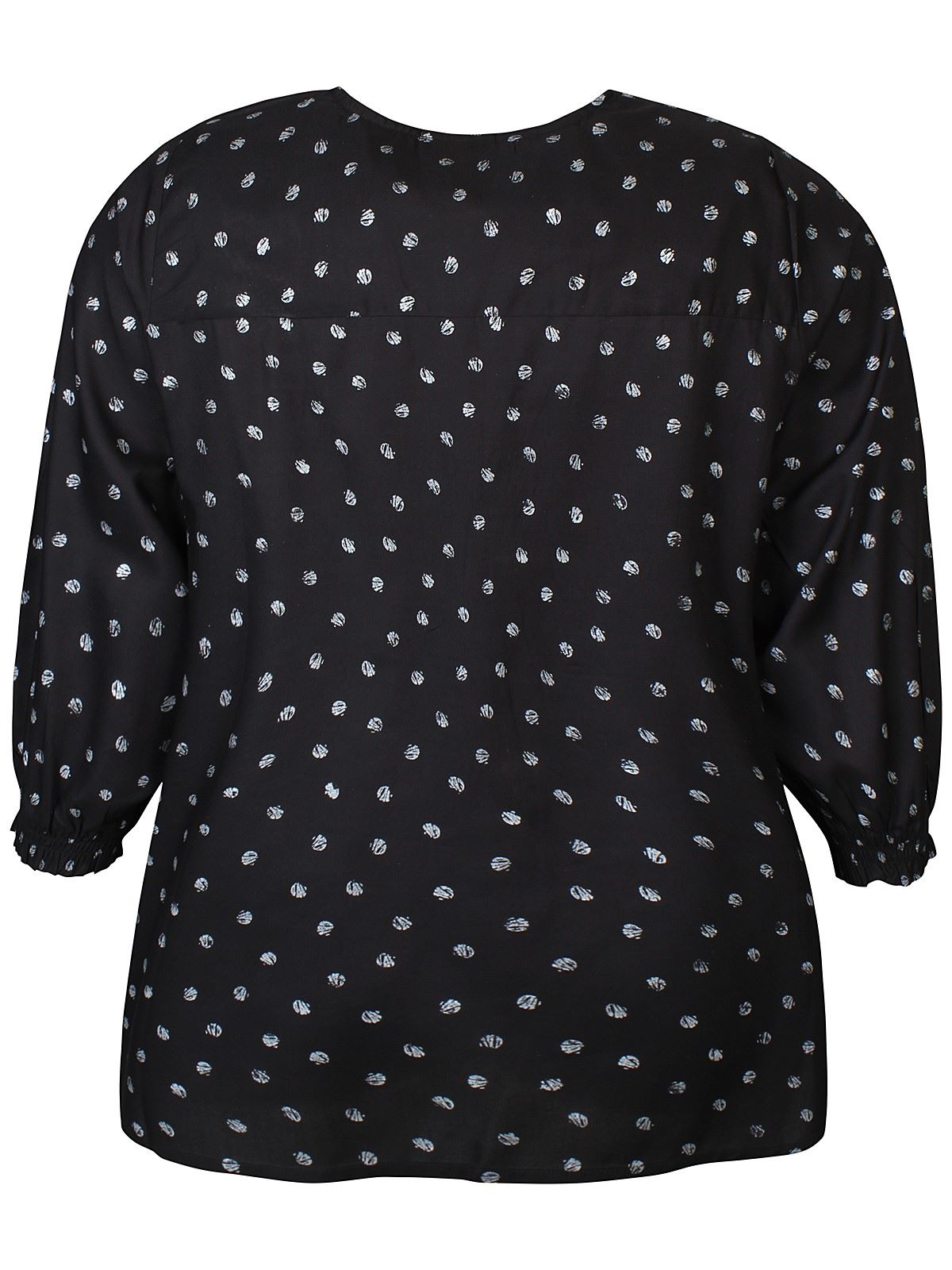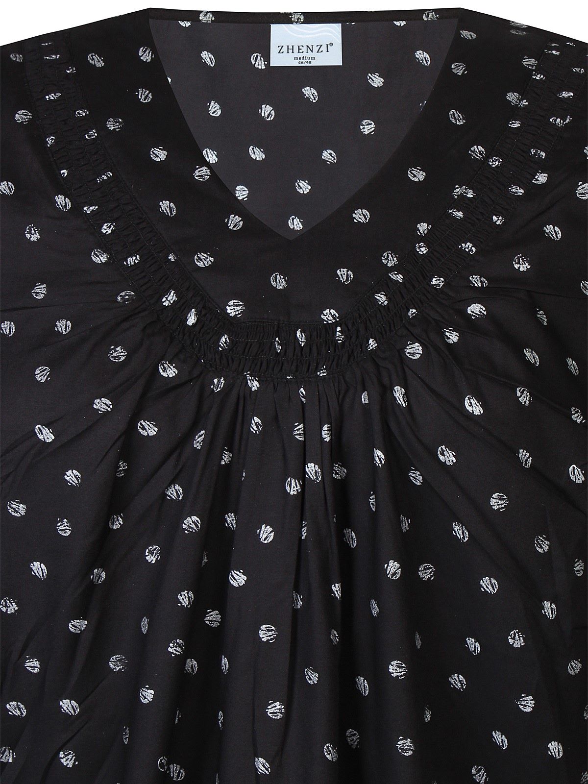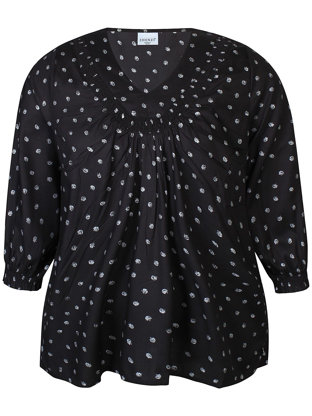 Zhenzin Vela pusero jossa mustalla pohjalla hopeanvärisiä kuvioita. V-pääntie, jossa rypytys. V aukon keskellä laskokset. 3/4 hihan pituus. Suora malli ja suora helma. Smokkirypytys hihansuissa.